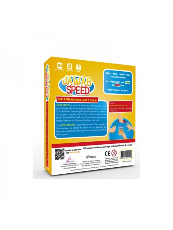 Jawâb speed est le jeu qui va mettre la bonne humeur chez vous ! En effet, pour y jouer il suffira de répondre à une multitude de questions sur la religion. Mais, et c’est ce qui va ramener un souffle d’euphorie, il faudra être rapide. Car, le but des créateurs de ce jeu de société est que chaque joueur enrichisse ses connaissances religieuses dans une ambiance gaie.