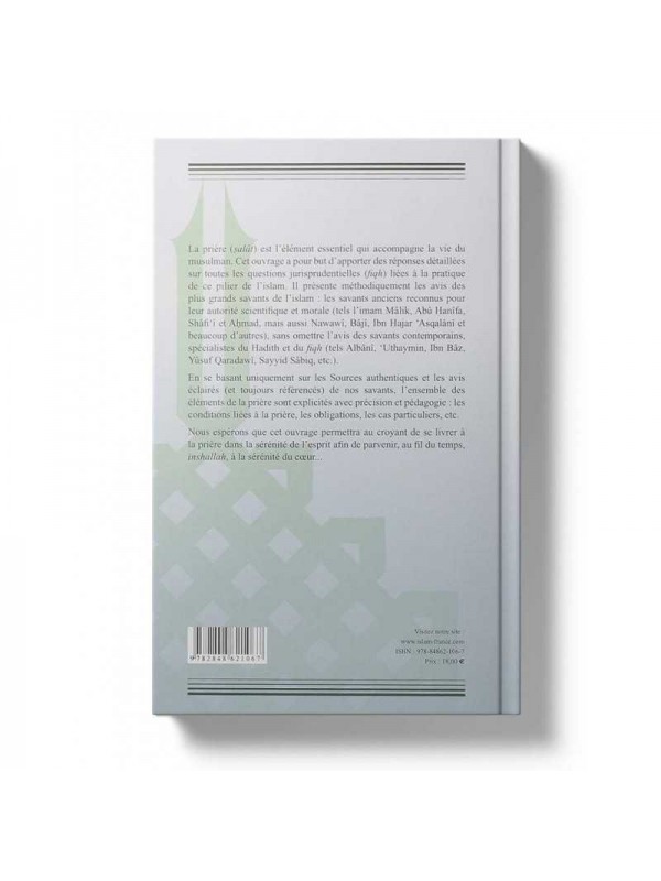 " La prière (salât) est l’élément essentiel qui accompagne la vie du musulman. Cet ouvrage a pour but d’apporter des réponses détaillées sur toutes les questions jurisprudentielles (fiqh) liées à la pratique de ce pilier de l’islam. Il présente méthodiquement les avis des plus grands savants de l’islam : les savants anciens reconnus pour leur autorité scientifique et morale (tel l’imam Mâlik, Abû Hanîfa, Shâfi’î et Ahmad, mais aussi Nawawî, Bâjî, Ibn Hajar ‘Asqalânî et beaucoup d’autres), sans omettre l’avis des savants contemporains, spécialistes du Hadith et du fiqh (tels Albânî, ‘Uthaymin, Ibn Bâz, Yûsuf Qaradawî, Sayyid Sâbiq, etc.).