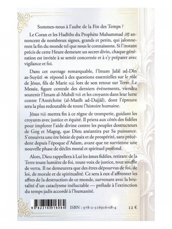 Dans cet ouvrage remarquable, l’Imam Jalâl ad-Dîn as-Suyûtî رحمه الله répond à des questions essentielles sur le rôle de Jésus, fils de Marie عليه السلام lors de son retour sur Terre. Le Messie, figure centrale des derniers événements, viendra soutenir l’Imam al-Mahdî عليه السلام et les croyants dans leur lutte contre l’Antéchrist (al-Masîh ad-Dajjâl), dont l’épreuve sera la plus redoutable de toute l’histoire humaine.
