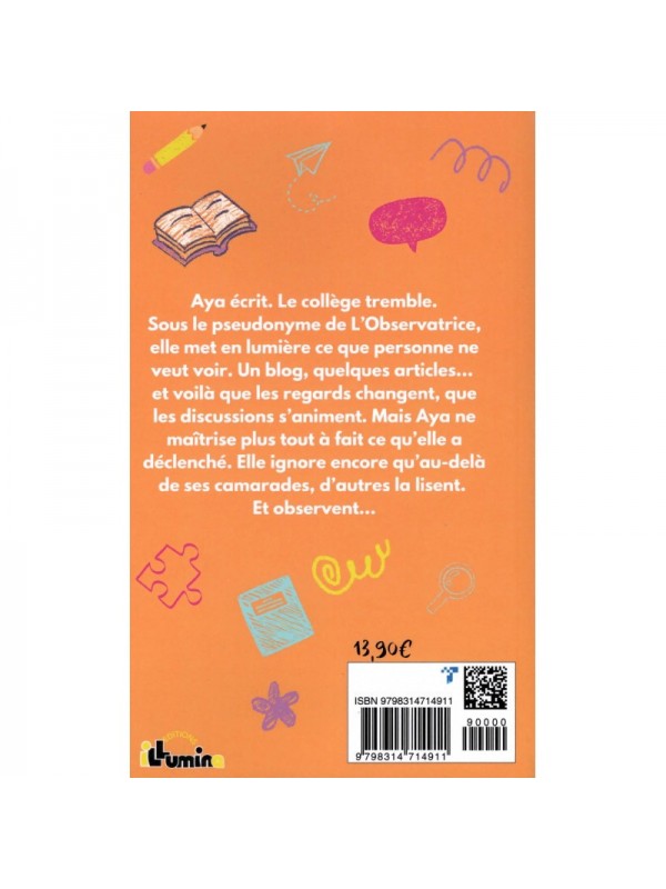 Aya, élève discrète de sixième, voit tout ce que les autres préfèrent ignorer : injustices, rumeurs, non-dits. Sous le pseudonyme de L’Observatrice, elle commence à publier anonymement sur le blog du collège pour révéler ce qui se passe vraiment. Son succès grandit, mais avec lui viennent les complications : soupçons, tensions, amitiés fragilisées. Aya découvre alors que dire la vérité demande du courage… et que chaque mot peut tout changer. Un roman captivant sur la justice, l’amitié et les choix difficiles qui façonnent l’adolescence.